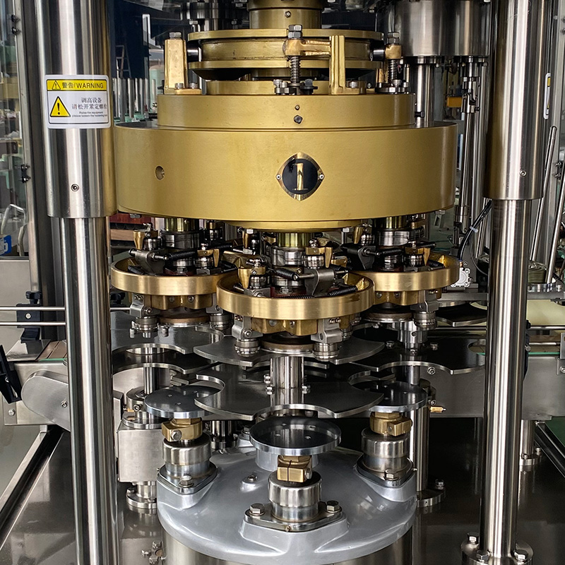 本機是一個具有四個工作頭的回轉(zhuǎn)式封罐機,在設計對內(nèi)部的零件具有裝拆方便,清洗,注油和維修操作簡易等優(yōu)點。機器運轉(zhuǎn)平衡,能迅速使罐頭的震動減少到最低限度,不存在汁液甩出的情況。兩個封口滾輪相對著裝置,使頭道和二道封口的運轉(zhuǎn)平穩(wěn),當需要檢查頭道的封口情況時,二道封口滾輪很容易卸開,有一個機械裝置使封口滾輪恢復至原來位置。
