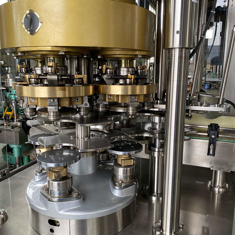 本機是一個具有四個工作頭的回轉(zhuǎn)式封罐機,在設計對內(nèi)部的零件具有裝拆方便,清洗,注油和維修操作簡易等優(yōu)點。機器運轉(zhuǎn)平衡,能迅速使罐頭的震動減少到最低限度,不存在汁液甩出的情況。兩個封口滾輪相對著裝置,使頭道和二道封口的運轉(zhuǎn)平穩(wěn),當需要檢查頭道的封口情況時,二道封口滾輪很容易卸開,有一個機械裝置使封口滾輪恢復至原來位置。
